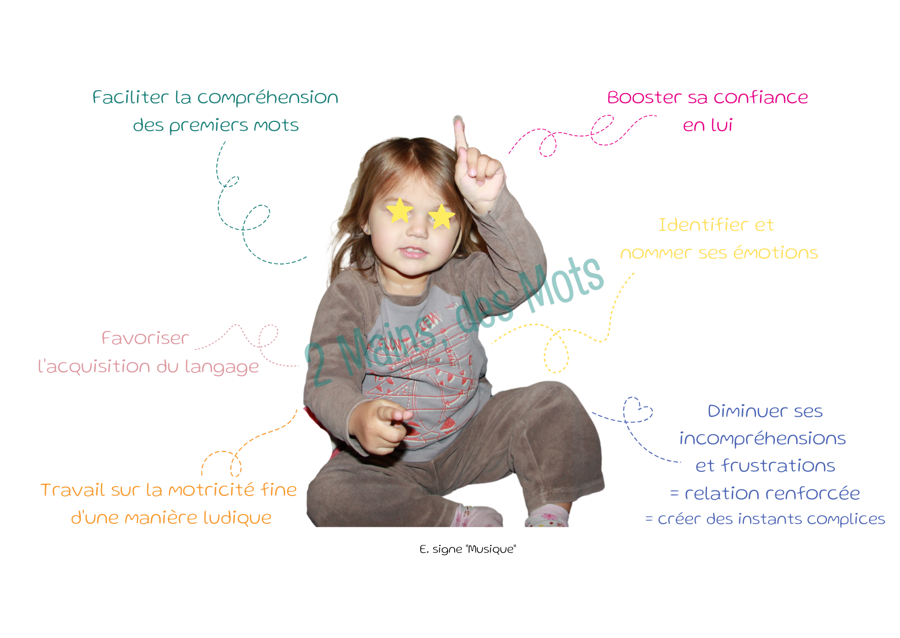 - Sixième avantage et pas des moindres : identifier et nommer ses émotions ! Les neurosciences nous indiquent l’importance d’exprimer ses émotions dès le plus jeune âge. En nommant et en signant ses propres émotions, l’adulte permet au jeune enfant d’identifier ce qu’il ressent et de les visualiser. L’enfant les reproduira par mimétisme et pourra à son tour utiliser les signes comme un outil au service de ses émotions.
